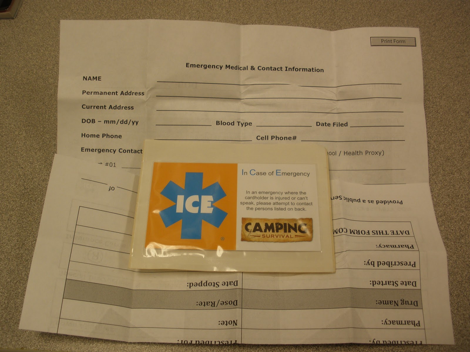 You can also carry the medical information and contact form here alone in the carrier or in combination with your particular ICE Card. The new Emergency Medical Contact Form also contains an extended "Current Medication" listing on the back for those who happen to be taking a boatload of medicines for some ailment. Download and print your own off the website.....